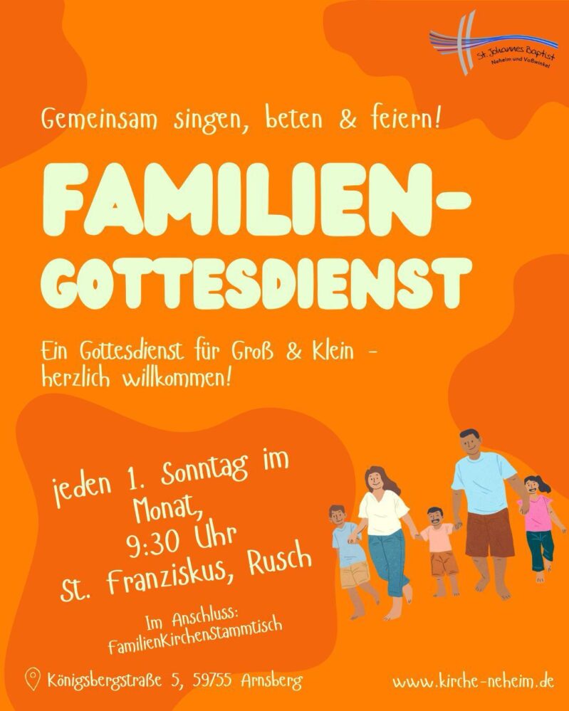 Gemeinsam singen, beten & feiern. Dazu laden wir jeden 1. Sonntag im Monat um 9.30 Uhr nach St. Franziskus in den Rusch ein. Im Anschluss ist noch FamilienKirchenStammtisch.