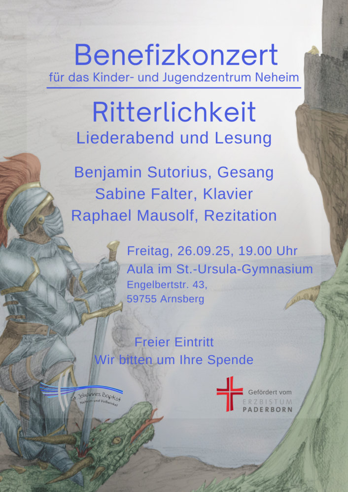 Neheim. Am Freitag, 26.09.25 findet um 19 Uhr in der Aula des St.-Ursula-Gymnasiums ein besonderer musikalisch-literarischer Abend statt. Unter dem Titel „Ritterlichkeit“ erwartet die Besucher ein vielseitiges Programm mit Werken von Händel, Wagner, Schumann, Ravel, und anderen – ergänzt durch literarische Texte aus dem Nibelungenlied, Cervantes Don Quichotte und Tolkiens Der Herr der Ringe….