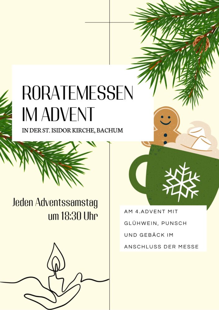 Am 4. Adventssamstag laden wir im Anschluss an die Hl. Messe um 18.30 Uhr in Bachum zu Glühwein, Punsch und Gebäck ein.