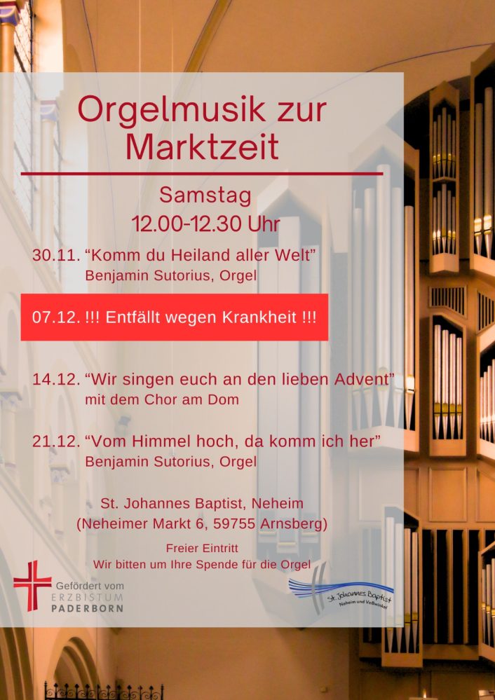 Orgelmusik Orgelmusik zur Marktzeit. Das Konzert wurde auf den 14.12. verschoben werden. Im Advent bietet unser Kirchenmusiker wieder an jedem Samstag eine halbe Stunde meditative Musik im Dom an.
