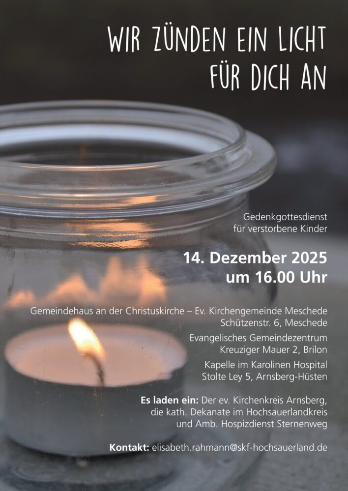 Im Sauerland laden die katholischen und evangelischen Kirchen und der Kinderhospizdienst „Sternenweg“ alle verwaisten Eltern, Geschwister, Großeltern und Freunde zu drei Gedenkgottesdiensten am 14. Dezember um 16.00 Uhr ein: